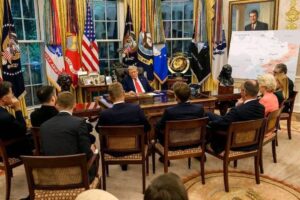 Le décor est solennel : tableaux de présidents américains aux murs, bustes historiques, bois massif du fameux Resolute Desk. Tout concourt à rappeler que le centre du pouvoir ne se situe pas à Bruxelles, ni à Paris, ni à Berlin, mais bien à Washington. Les leaders européens, souvent en désaccord sur leurs propres politiques intérieures, semblent ici unis autour de leur allié américain, dans une posture quasi scolaire : écouter, prendre des notes, attendre la parole du maître de cérémonie.